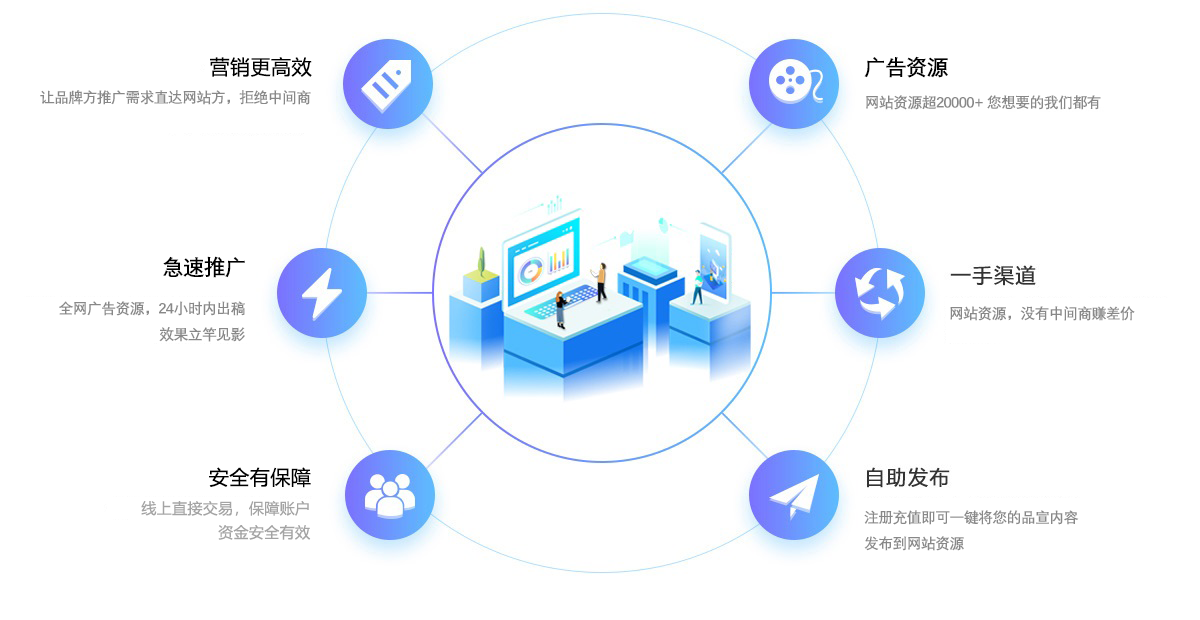 广告资源一键发布,迅 速将您的产品和企业信息覆盖至 全网各个渠道。 -